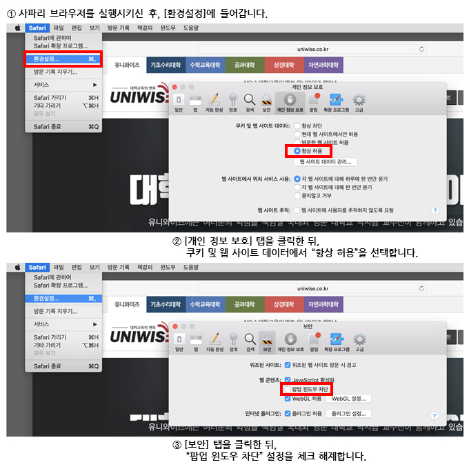 우선 아래와 같은 순서대로 시도하시어 사파리 브라우저의 설정값을 적용하시기 바라며, 그럼에도 불구하고 오류사항을 해결하지 못하신 경우 고객행복센터(1899-7454)로 연락주시면 신속히 도와드리도록 하겠습니다.